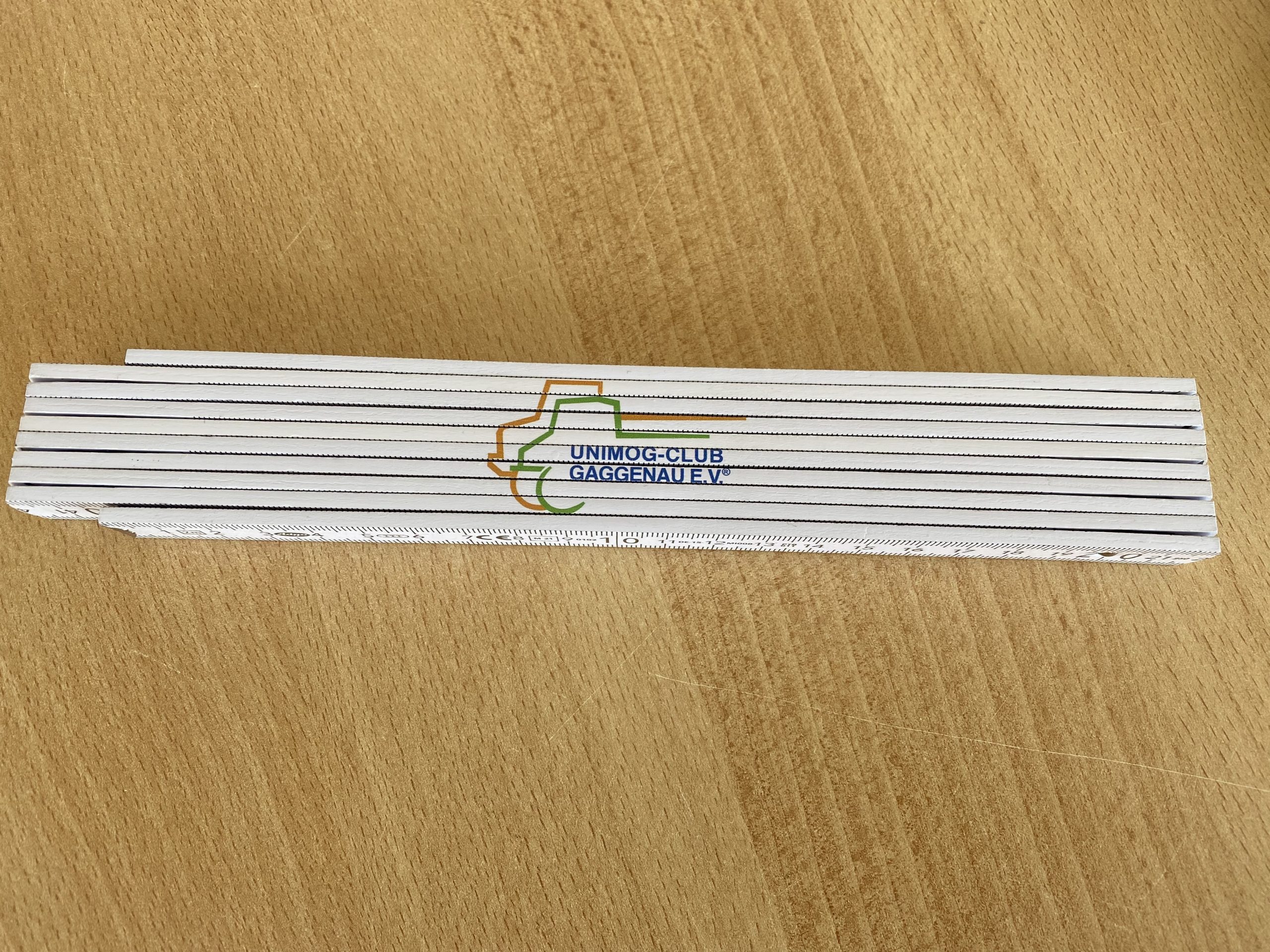 Farbe weiß, Länge 2 m aus hochwertigen Buchenholz, incl. 2-seitiger Druck mit unterschiedlichen Logos (UCG und Unimog-Museum)